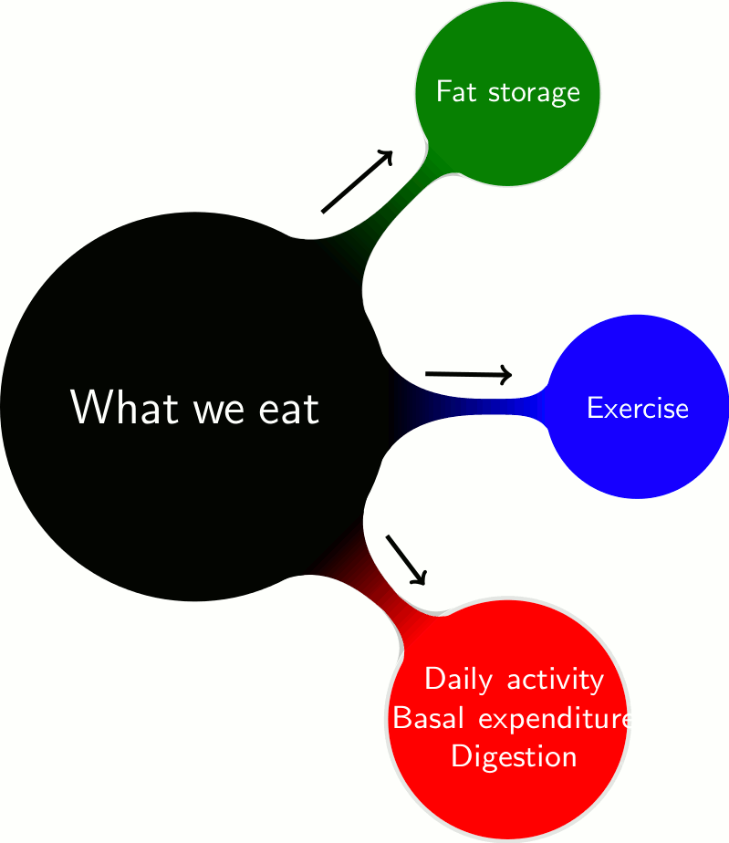 O de forma gráfica, lo que comemos o se almacena como grasa, o lo quemamos con el ejercicio o nuestro cuerpo lo gasta de otras formas: