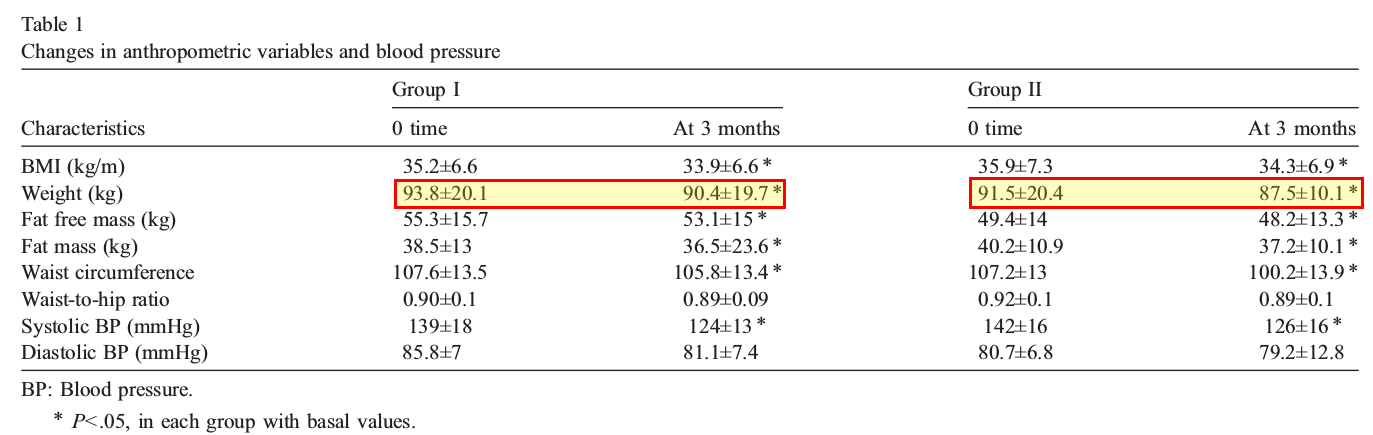 But in any case in this study (see figure below), after three months, those on diet I lost 3.4 kg, while those on diet II lost 4 kg. In the first case from 93.8 to 90.4 kg, and from 91.5 to 87.5 kg in diet II . The difference between these two high-carbohydrate diets is only 600 grams. But group I weighed 2.3 kg more at the baseline than the other group so the difference in the final weight is 2.9 kg.