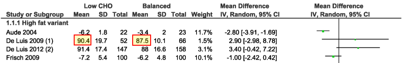 However, in the meta-analysis the numbers are placed in the wrong column: 2.9 is assigned to the low-carb diet and 3.4 to the «balanced»: