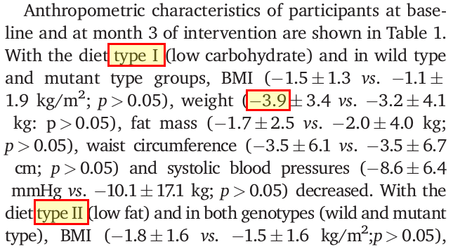 But now the results are obtained for people with a particular variant of a gene (just read the title: Evaluation of weight loss and adipocytokines levels after two hypocaloric diets with different macronutrient distribution in obese subjects with rs9939609 gene variant), so the results can not be extrapolated to the general population. The second line of the abstract informs us that this variant has been associated with a high risk of obesity.