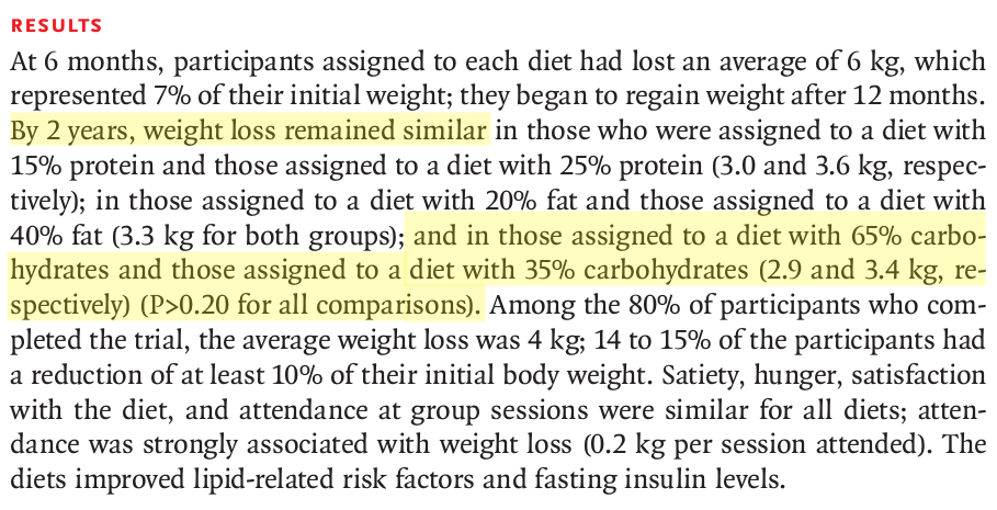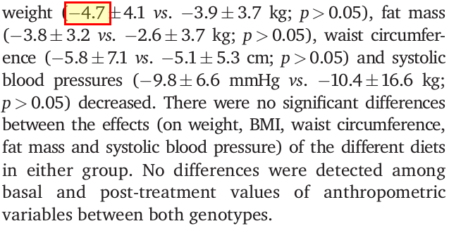 However, in the meta-analysis the authors convert this difference of 600 g between two high-carbohydrate diets in 2.9 kg, because they make the nonsense of comparing the final weight of the participants, regardless of the fact that one of the groups weighed significantly more than the other one at baseline.