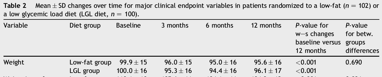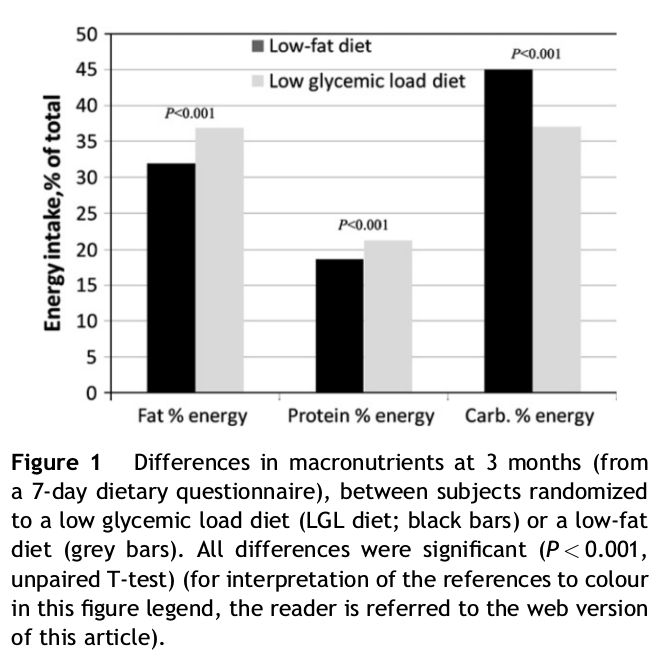 Out of curiosity I also looked at the Klemsdal 2010 study , a one year duration study in which the diet of the participants was monitored at 3 months and as you can see the low glycemic index diet (which is not the same as low carbohydrate) had about 37% of calories from carbohydrates. That’s not a low carbohydrate diet.