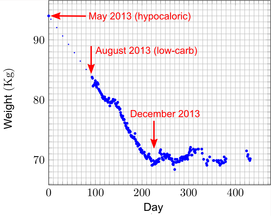 I kept controlling what I ate and my weight responded, as you can see in the graph above. My weight did not go down too fast (between half a kilo and a kilo per week, I think) and I occasionally reached plateaus, but they disappear after a few days. I weighed every day and wrote down my weight on a spreadsheet and fatsecret.es. Although my first goal was 76Kg (from the initial 94), when I reached 76 I changed my mind and wanted to go to 72. Upon reaching 72Kg, I changed my mind again and I set 70Kg as the new goal. I reached 69Kg, but in a few days I returned to 70Kg. Since then I have never stopped eating low-carb, counting calories the first weeks but I stopped counting. I don’t exercise as much as before. I stay in the range of 70-71Kg, I do not starve and I’m better than ever (in all senses). My current carbohydrate intake is limited to daily intake of probiotics (kefir) and salad vegetables, and a piece of pepper, broccoli, brussels sprouts, etc.. now and then. I barely eat fruit and I avoid anything that contains gluten. Of course no pasta, bread or potatoes.