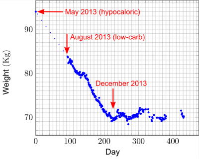 Will I keep this weight in the long term? No clue. The name of this blog (I won’t be fat again) says I want to. I will not change my way of eating and I hope I will not be fat again. As a curiosity in Andreas Eenfeldt’s blog I see the weight graph of another low-carber, one who has kept his weight for two years after losing 90Kg (198 pounds) in one and a half years. http://www.dietdoctor.com/will-lchf-work-long-term-say-four-years
