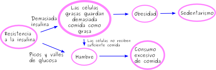 En resumen, cuando una persona tiene resistencia a la insulina, su pancreas necesita generar demasiada insulina para controlar los niveles de azúcar en sangre (esa función se realiza en todas las personas, no es exclusivo de los diabéticos). Pero la insulina es la principal hormona que regula la acumulación de grasa en las células grasas: ese exceso de insulina va a hacer que las células grasas o adipocitos almacenen más grasa de lo normal. El alimento se almacena como grasa, no se consume, por lo que el resto de células del cuerpo están desnutridas y consecuentemente nuestro cuerpo sigue pidiendo comida, razón por la que vamos a necesitar volver a comer. No engordamos por comer demasiado y hacer poco ejercicio: engordamos y comemos demasiado porque tenemos un problema metabólico. Una vez estamos gordos nos volvemos sedentarios. La obesidad no es una cuestión de glotonería ni de falta de voluntad ni de holgazanería.