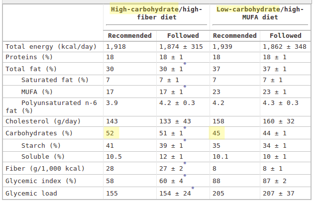 This article compares two diets: «Effects of a Plant-Based High-Carbohydrate/High-Fiber Diet Versus High–Monounsaturated Fat/Low-Carbohydrate Diet on Postprandial Lipids in Type 2 Diabetic Patients«. The authors say «our results confirm that this kind of diet [high-carb/high-fiber] is to be preferred to a diet low in carbohydrate and rich in MUFA«.