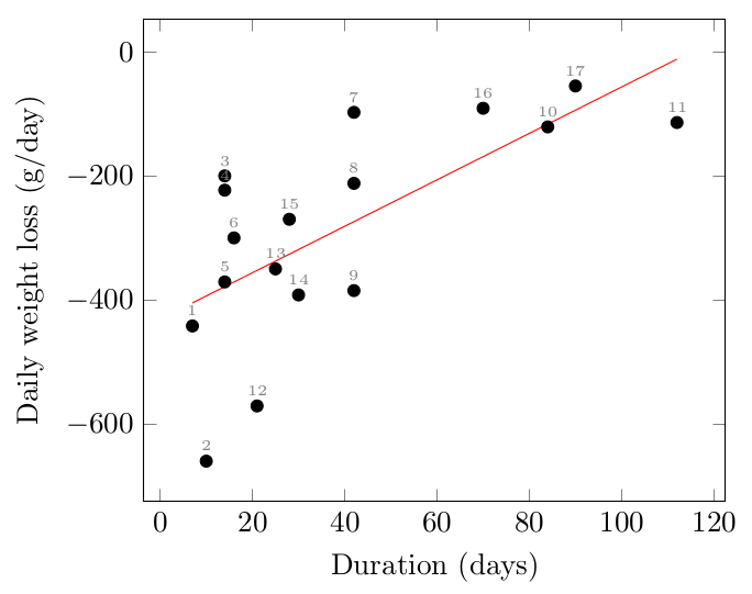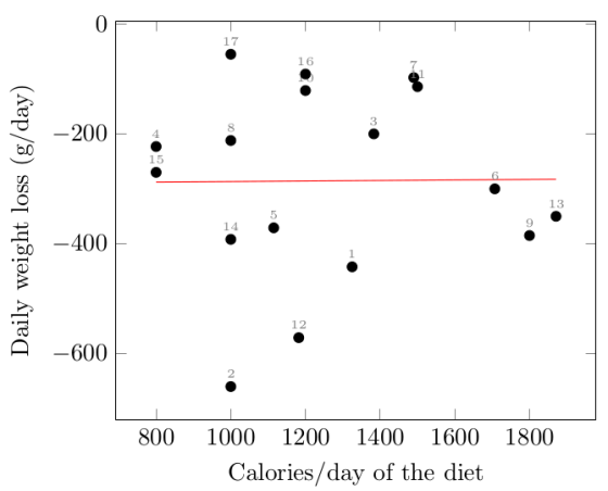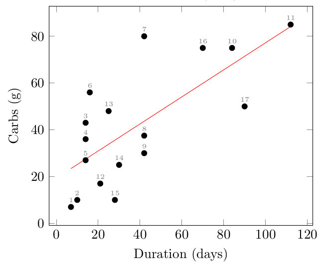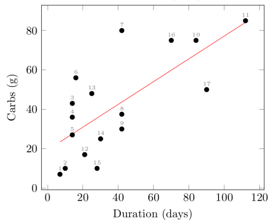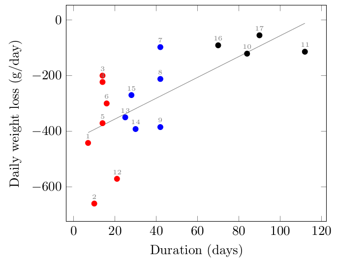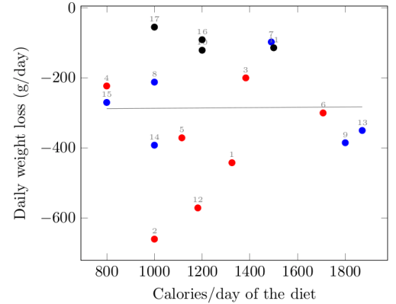 - For the longest studies (black points), there seems no be no impact of the carb intake on the daily weight loss but please note that incidentally the carb intake in those studies was always high. More points would be needed to draw conclusions.