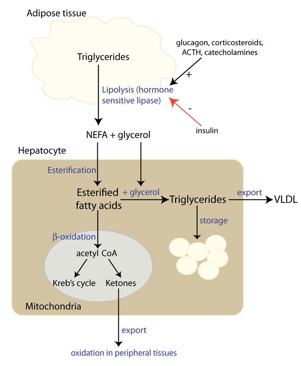 Olvidemos por un momento la insulina y pongámonos en el caso de que la lipólisis no está inhibida. En los hepatocitos los ácidos grasos no esterificados (NEFA) resultantes de la lipólisis se pueden emplear (ver esquema más abajo) en a) producir energía (ciclo de Kreb), o b) ser reempaquetados como triglicéridos y exportados como lipoproteinas de muy baja densidad (VLDL) o c) almacenados en el hígado, o d) convertidos en cuerpos cetónicos.