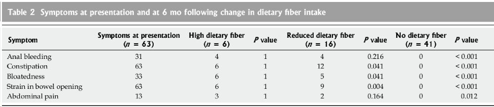 - Cuando se inició el estudio 31 de los 63 tenían sangrado anal. A los 6 meses ninguno del grupo sin-fibra tenía síntomas.