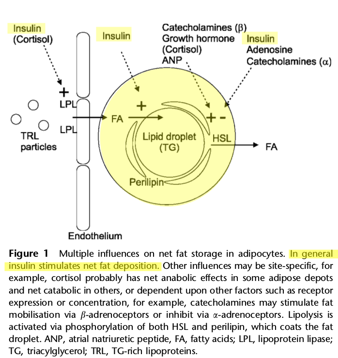 In the figure caption we can read: «In general, insulin stimulates net fat deposition«. We can see in the scheme how on one hand insulin stimulates the uptake of fatty acids (indicated by two + signs) into the adipocyte, while on the other hand it suppresses the mobilization of the fat already inside of the adipocyte (indicated with a – sign in the scheme). In the text of the article we find the following explanations :