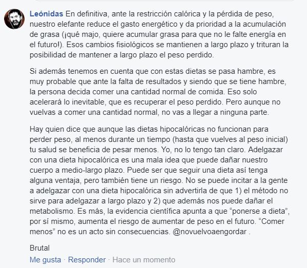 Hay quien dice que aunque las dietas hipocalóricas no funcionan para perder peso, al menos durante un tiempo (hasta que vuelves al peso inicial) tu salud se beneficia de pesar menos. Yo, no lo tengo tan claro. Adelgazar con una dieta hipocalórica es una mala idea que puede dañar nuestro cuerpo a medio-largo plazo. Puede ser que seguir una dieta así tenga alguna ventaja, pero también tiene un riesgo. No se puede incitar a la gente a adelgazar con una dieta hipocalórica sin advertirla de que 1) el método no sirve para adelgazar a largo plazo y 2) que además nos puede dañar el metabolismo. Es más, la evidencia científica apunta a que «ponerse a dieta», por sí mismo, aumenta el riesgo de aumentar de peso en el futuro. «Comer menos» no es un acto sin consecuencias.