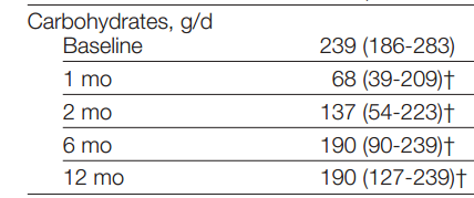 - Dansinger et al. En la siguiente tabla se muestra la cantidad de hidratos de carbono a lo largo del estudio en la dieta que se supone que es VLCKD. Nunca fue cetogénica y pasado el primer mes ni siquiera low-carb.