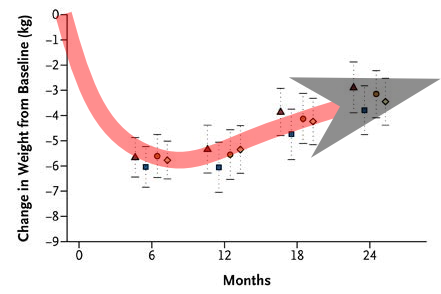 Tras los primeros seis meses la pérdida de peso era de 6Kg. En los 18 meses siguientes recuperaron la mitad del peso perdido, quedándose en una pérdida de global 3.5 Kg. No habían conseguido mantener a largo plazo el irrisorio peso perdido en los primeros seis meses.