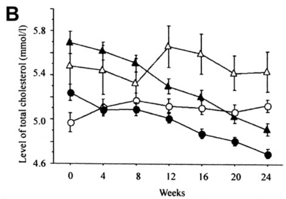 En negro, la dieta LCKD, en blanco la LC. Los diabéticos representados con triángulos, los no diabéticos con círculos.
