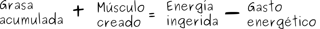 Pero no es verdad. Del mismo modo que de una correlación no puede deducirse causalidad, la fórmula anterior no nos dice porqué acumulamos grasa ni cómo evitarlo. Solo es una igualdad matemática, algo que debe cumplirse, nada más. Cambia el orden de los términos, para que no parezca que la acumulación de grasa depende de lo que está al otro lado. Añade el término del músculo desarrollado. Y no confundas gasto energético con ejercicio físico, ni ignores que lo que comes y el ejercicio físico afectan a todos los elementos de la fórmula. Mira la fórmula nuevamente: