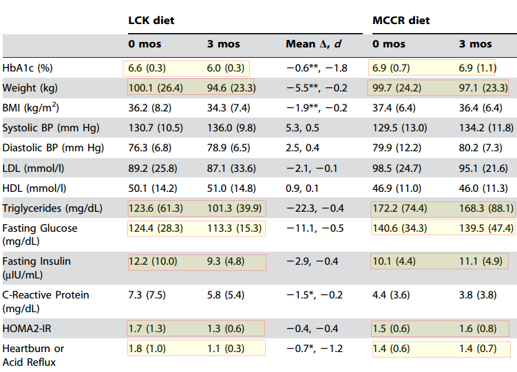 En el grupo LCK el 44% de los individuos redujo la medicación oral para la diabetes. En el grupo MCCR solo un 11% de los participantes la redujo.