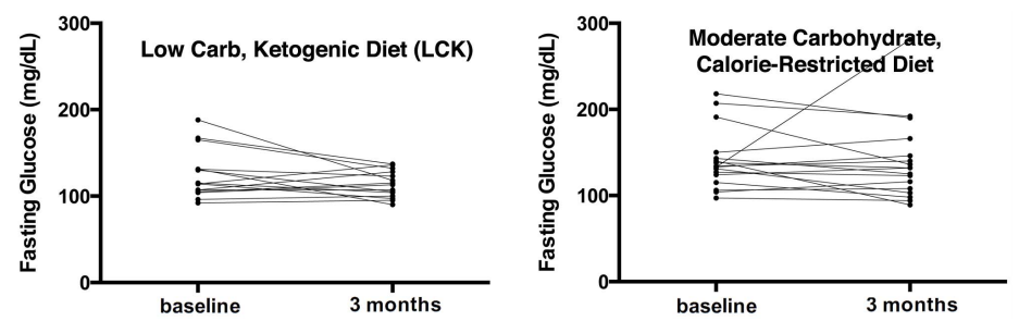 Estudio publicado hace un año, de título: «A Randomized Pilot Trial of a Moderate Carbohydrate Diet Compared to a Very Low Carbohydrate Diet in Overweight or Obese Individuals with Type 2 Diabetes Mellitus or Prediabetes«.