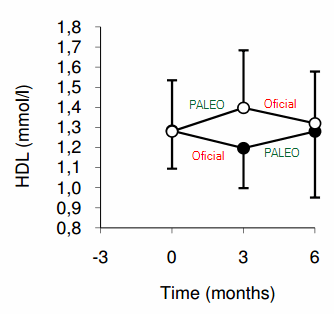 Tras tres meses de dieta, se sometió a los participantes a un test oral de tolerancia a la glucosa. En la dieta paleo la glucosa se elevó un 26% menos (área bajo la curva) que antes de empezar el estudio. En la dieta tipo mediterránea ese mismo parámetro solo decreció un 7%. Una mala tolerancia a la glucosa aumenta el riesgo de la enfermedad cardiovascular