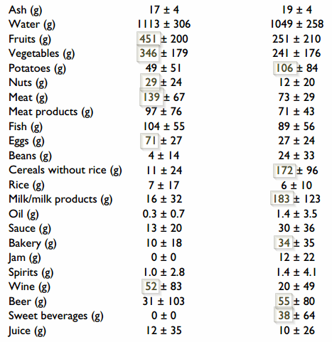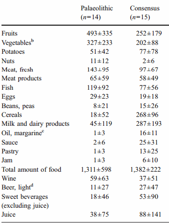 En los macronutrientes no se percibe una gran diferencia entre ambas dietas, similar cantidad de grasa, similar cantidad de proteína, pero diferente cantidad de carbohidratos: 125 g diarios en la paleo, 196 g en la «oficial». La dieta paleo tenía más fruta, más vegetales, más carne fresca, más frutos secos, más huevos y prácticamente nada de cereales, bebidas dulces o lácteos.