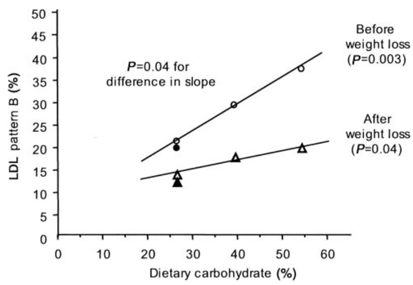 El resultado fue que el porcentaje de partículas densas y pequeñas (patrón B) en el LDL se redujo con la pérdida de peso, pero también conforme el porcentaje de carbohidratos de la dieta se reducía. Los círculos son valores antes de la pérdida de peso. Los triángulos son valores tras la pérdida de peso.