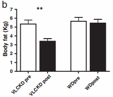 Es el mismo resultado obtenido, por ejemplo en el estudio «Ketogenic diet does not affect strength performance in elite artistic gymnasts«. La dieta se aplicó durante un mes y los participantes eran gimnastas de élite que siguieron con sus entrenamientos habituales durante el estudio. Con la dieta baja en hidratos de carbono se perdió más grasa corporal (las dos barras más a la izquierda muestran la grasa corporal antes y después de esa dieta), sin un cambio significativo en la masa no-grasa, mientras que una dieta más alta en hidratos de carbono no redujo la grasa corporal (las dos barras más a la derecha en la gráfica muestran la grasa corporal antes y después). Al igual que en el estudio anterior, con la dieta low-carb de forma natural se redujo la ingesta calórica.