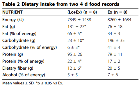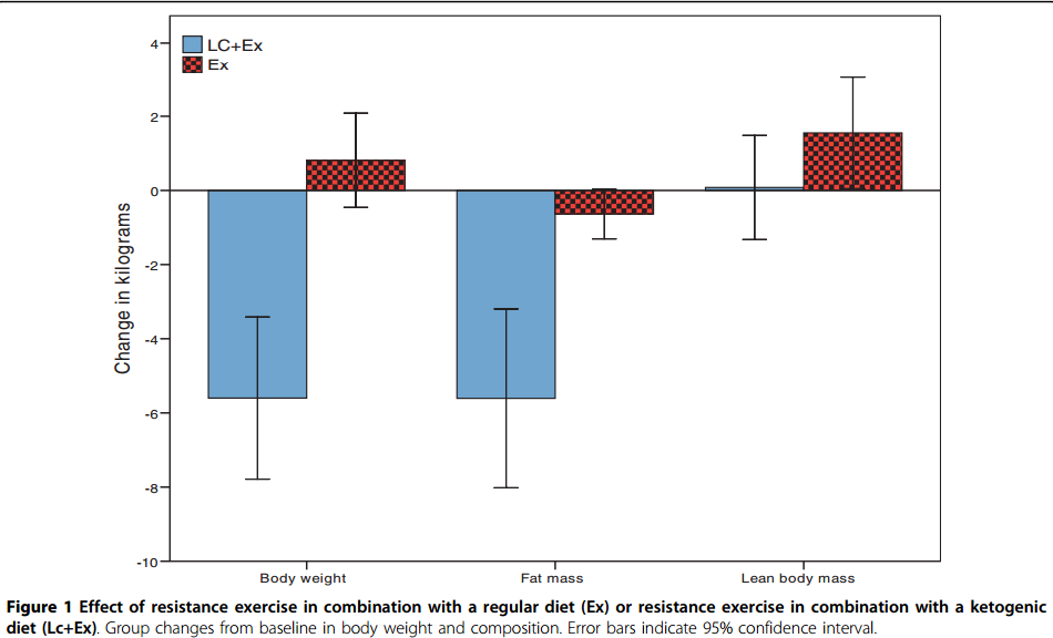 El grupo Lc+Ex no cambió su masa no-grasa (lean body mass), pero cabe pensar que aumentó un poco la musculatura, puesto que con una dieta cetogénica debió de haber una cierta pérdida de peso en forma de agua y glucógeno (ver). El grupo Ex, dieta high-carb, incrementó su masa no-grasa en 1.6 Kg, posiblemente musculatura. En total, el grupo Ex, el grupo high-carb, prácticamente no perdió grasa corporal y subió de peso.