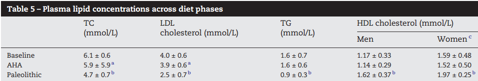 El resultado fue que todo en el perfil lipídico fue mejor con la dieta paleolítica que con la dieta AHA: menos triglicéridos (44% menos) y más HDL (un 35% más). Espectacular.