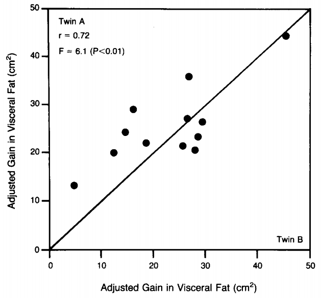 Los participantes fueron 12 parejas de gemelos. Como hemos visto, los resultados fueron impredecibles, pero curiosamente fueron parecidos entre los miembros de cada pareja. Si representamos en una gráfica la grasa visceral acumulada por el gemelo A frente a la grasa visceral acumulada por el gemelo B, vemos que el punto se sitúa casi siempre cerca de la recta Gemelo A = Gemelo B: