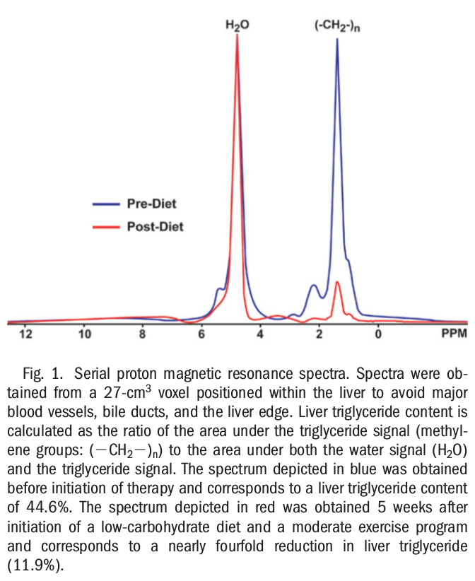 Cinco semanas de una dieta baja en hidratos de carbono (y en calorías: 1000 kcal/día) redujeron el contenido en triglicéridos del hígado de un paciente desde un 44.6% inicial hasta un 11.9%. Antes de la dieta la resonancia magnética daba un pico muy claro (curva azul) en contenido en triglicéridos. Tras la dieta baja en hidratos de carbono (curva roja), el pico de los triglicéridos se ha reducido drásticamente .