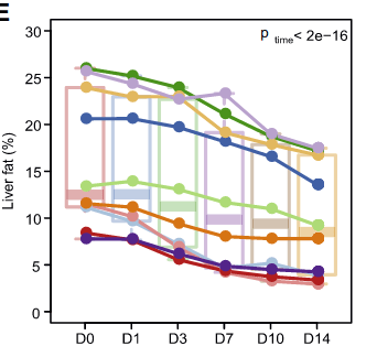 All the subjects lost weight (mean weight loss: 1.7 kg at day 3 and 3.0 kg at day 10) but this was not correlated with changes in hepatic fat percentage.