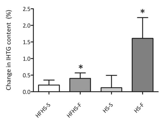 A los participantes se les dió o bien un exceso de azúcar (HS-) o un exceso de grasa y azúcar (HFHS-), en dos modalidades: junto con las tres comidas principales (-S) o como snack entre comidas (-F). El resultado es que el snack de azúcar provocó el mayor aumento, con diferencia, de grasa en el hígado (IHTG).