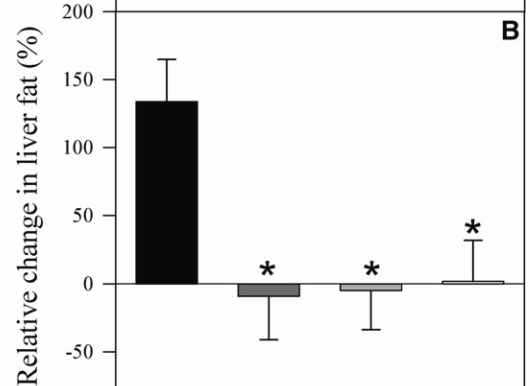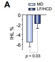 Durante seis semanas una dieta con un 34% de carbohidratos mejoró más el contenido en grasa del hígado que una dieta con un 49% de carbohidratos (IHL es el contenido en lípidos del hígado). Esa dieta, la marcada como MD en la gráfica tenía más del doble de grasa que la otra y muchas más calorías (un 19% más).