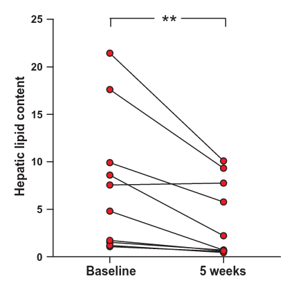 En dos semanas la grasa hepática se redujo un 55% con la dieta restringida en carbohidratos, pero solo un 28% con dieta restringida en calorías. La dieta restringida en carbohidratos tenía 200 kcal/día más que la hipocalórica.
