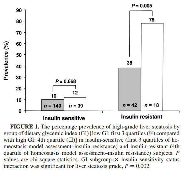 Hay estudios observacionales en humanos (ver,ver) que nos llevarían a la misma conclusión: los carbohidratos de rápida absorción son los peores para el hígado graso en personas con resistencia a la insulina.