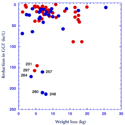 Trece meses de dieta baja en hidratos de carbono redujo los niveles de GGT en todos los participantes. En término medio −29.9 iu/L. En la gráfica se muestra que la reducción en la GGT no guardó relación con la pérdida de peso.