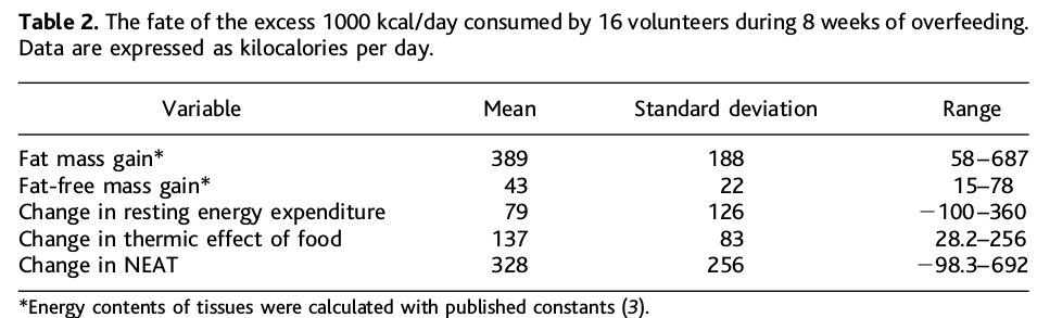 En término medio, 432 kcal/día del exceso de energía ingerido fue acumulado y 531 kcal/día fueron disipadas a través del gasto energético, contabilizándose un 97% de las 1000 kcal/día adicionales (suponiendo seguimiento óptimo). La ganancia en grasa varió en un factor 10 entre los voluntarios, desde tan solo 0.36Kg hasta 4.23 Kg.