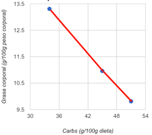 Pero la grasa corporal al final del estudio es diferente según la dieta. En la figura se muestra el porcentaje de grasa corporal según la composición de la dieta. Desde 9.8% en la que menos hasta 13.3% en la que más: