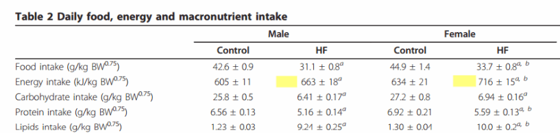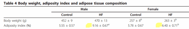 Con la dieta HF las ratas hembra tuvieron una ingesta calórica mayor que las ratas macho. Las ratas macho acabaron con mucha más adiposidad. Repito: menos ingesta calórica produjo más adiposidad.