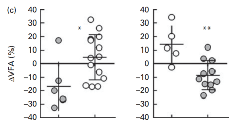 Cambios en la grasa visceral (visceral fat area, VFA) consumiendo arroz blanco (círculos blancos) o arroz integral (círculos grises):