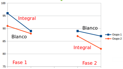 Cambios en el perímetro de la cintura en un experimento en el que dos grupos de participantes consumen arroz integral y luego blanco (grupo 1), o primero blanco y luego integral (grupo 2). Dietas hipocalóricas, de unas 1500 kcal/día: