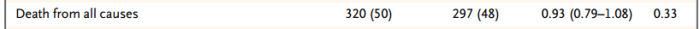 Pero dado el número de participantes, estamos hablando de muy pocas muertes para que los datos sean significativos: 66 muertes en un grupo y 46 muertes en el otro. La diferencia son 20 muertes en total. 18 muertes por causa cardíaca en un grupo, 22 en el otro.