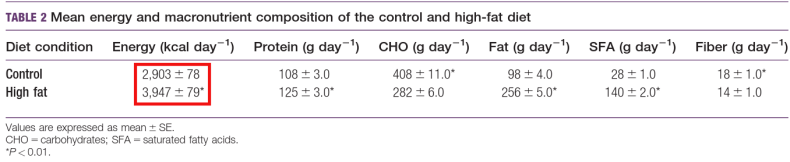 Experimento en humanos (varones jóvenes). Durante 4 semanas se comparan dos dietas denominadas «high-fat» (alta en grasa) que aportan unas 1000 kcal/día más de las que se creen necesarias para mantener el peso corporal: