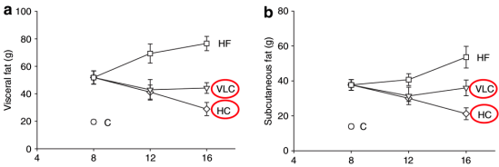 En las siguientes gráficas podemos comprobar cómo esos mismos grupos HC y VLC han acabado con diferente cantidad de grasa corporal (visceral a la izquierda, subcutánea a la derecha):
