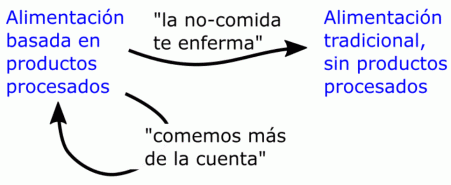 Cuando esas mismas poblaciones se pasan a la «dieta occidental» (harinas, azúcar, productos procesados, aceites obtenidos por procedimientos industriales, etc.) vienen los problemas de salud. Las mismas poblaciones que nunca han tenido problemas con la cantidad de comida —aunque a buen seguro su ingesta diaria ha sido altamente variable— ahora tienen un problema de salud y se nos dice que el problema es de cantidad de comida, de «exceso», y que ya no se cansan para obtener los alimentos. Reitero la pregunta: si el problema es el «exceso», ¿cómo puede ser que en esos pueblos nadie cometiera un error de cálculo en cuánto comía, consumiendo cada día un par de gramos «de más»? ¿Nadie anduvo unos metros «de menos» cada día y engordó? La teoría de que el problema de la obesidad es un problema de cantidad de comida, que comemos «de más», entra en clara contradicción con la observación de qué sucede en esos pueblos.