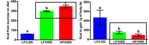 Energy efficiency (the amount of energy needed to gain 1 g of body fat) was dramatically altered by high sugar diets. Both LF/HSD and HF/HSD rats were required to consume significantly fewer calories to gain a gram of body fat than the LF/LSD animals