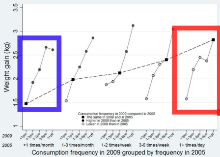 Dentro de cada grupo (por ejemplo el remarcado en azul), nos dan datos de ganancia de peso según su consumo de bebidas azucaradas al final del seguimiento: menor consumo a la izquierda, mayor consumo a la derecha. En todos los grupos, se ganó más peso corporal si fue mayor el consumo de esos productos. Nótese que los que redujeron su consumo respecto del inicio del seguimiento, indicados con círculos blancos, no engordaron tanto como los que mantuvieron o aumentaron sus niveles de consumo. Y eso sucedió en los cinco grupos. De los que inicialmente más consumían (grupo resaltado en rojo), aquellos que redujeron en mayor medida su consumo (círculo blanco en parte inferior), tuvieron un incremento de peso corporal de los más bajos de todo el estudio.
