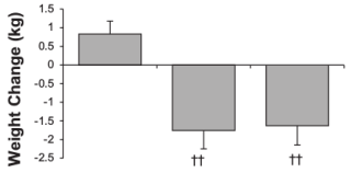 En este experimento podemos encontrar un resultado parecido al del estudio anterior: se ha perdido casi la misma grasa corporal (barra gris) que músculo se ha ganado (barra negra). Siendo que se ha perdido peso (barra blanca), ha habido un «déficit calórico», pero éste no puede explicar ni el crecimiento del tejido muscular ni la reducción del tejido adiposo.