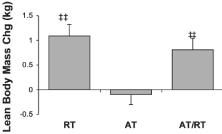 En este estudio el grupo RT (Resistance Training) gana 830 g de peso, que se distribuyen en una ganancia de 1090 g de masa no grasa y una pérdida de 260 g de grasa corporal. Es decir, ese grupo ha subido de peso al tiempo que ha perdido grasa corporal.
