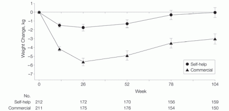 The observed average weight regain at 3 years of all but about 3 kg of the lost weight contrasts with the expected weight loss of more than 12 kg that our model predicts would have resulted had the individuals eaten their self-reported energy intake (data not shown).89 These diverging results highlight the well-known deficiencies in the assessment of free-living energy intake (fuente)
