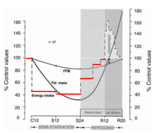 2) Se sabe que existe una adaptación fisiológica al hambre (o a algo relacionado con la restricción en la cantidad de comida). Es algo que está documentado una y otra vez en la literatura científica. Se conocen múltiples mecanismos por los que el cuerpo humano fomenta la recuperación de la grasa corporal (aumento de la activación de la LPL, especialmente de su respuesta a la insulina, reducción de la lipólisis, mayor eficiencia muscular al realizar actividad física, reducción de la tasa de oxidación de grasas, etc.)